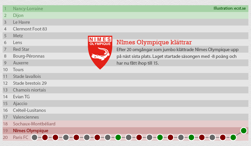 Förra säsongen fälldes Nîmes Olympique för ett antal uppgjorda matcher och fick därför starta säsongen med åtta minuspoäng. Det tog 20 omgångar att lämna jumboplatsen. 6-2 hemma mot topplaget Clermont samtidigt som nykomlingen Paris FC föll i sin match innebar att lagen bytte plats i botten av Ligue 2.